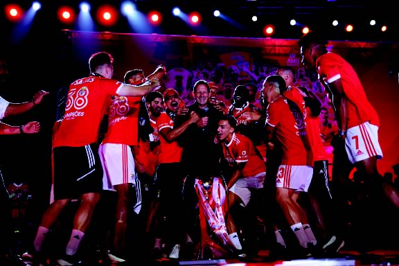 Os `encarnados' partiram em busca do golo deste o apito inicial e a resistência do Santa Clara durou apenas sete minutos, com Gonçalo Ramos, no primeiro lance de perigo, a responder de cabeça a um cruzamento de Bah da direita, para a primeira `explosão' de alegria na Luz. O Benfica dominava um pouco esclarecido Santa Clara, mas não criava perigo, e depois de um susto num cabeceamento do central Ítalo, os `encarnados', aos 28 minutos, aproveitaram um livre mal executado pelos açorianos e saíram num rápido contra ataque conduzido por Rafa, que tabelou com João Mário, e surgiu solto na área a fazer o segundo golo da tarde, num remate que ainda sofreu um desvio num defesa. Depois da eficácia demonstrada na primeira parte, o segundo tempo começou com o Benfica de novo no controlo das operações, mas a jogar a um ritmo mais pausado e após um lance de perigo de Rafa, os `encarnados' chegaram ao terceiro aos 60, numa grande penalidade assinalada por Rui Costa depois de intervenção do videoárbitro. O espanhol Grimaldo, que vai deixar o clube para alinhar nos alemães do Bayer Leverkusen, foi chamado a marcar e não vacilou, emocionando-se no momento de celebrar com os adeptos. Com a festa nas bancadas a subir de tom, o Santa Clara teve as suas melhores oportunidades na partida, primeiro com Ricardinho a antecipar-se a Bah, mas a cabecear ao lado, e depois com Odysseas a travar primeiro um remate de Ricardinho e depois a recarga de Andrezinho. Com tudo decidido, o jogo `arrastou-se' até ao fim, com tempo ainda para Schmidt lançar em campo o jovem guarda-redes Samuel Soares nos minutos finais, que assim também se sagra campeão. Pouco depois chegou o apito final do árbitro Rui Costa e a festa que já se fazia nas bancadas entendeu-se ao relvado, depois de assegurado o 38.º título de campeão nacional do Benfica, que vai ser celebrado em todo o país e em vários locais do mundo. AJO/DYRP // JP | Lusa | ||||